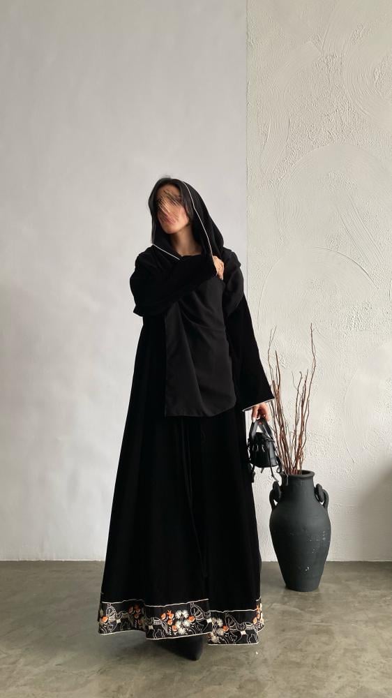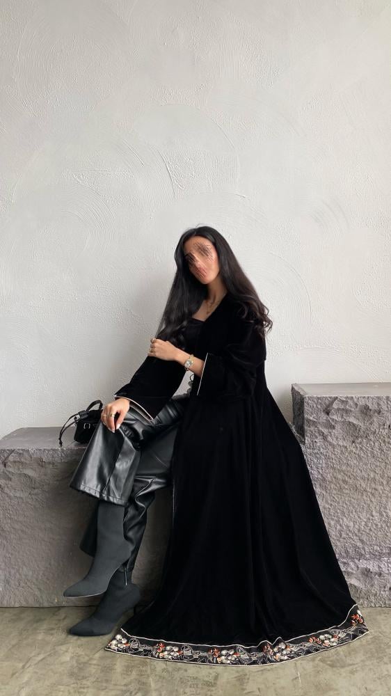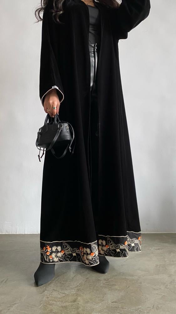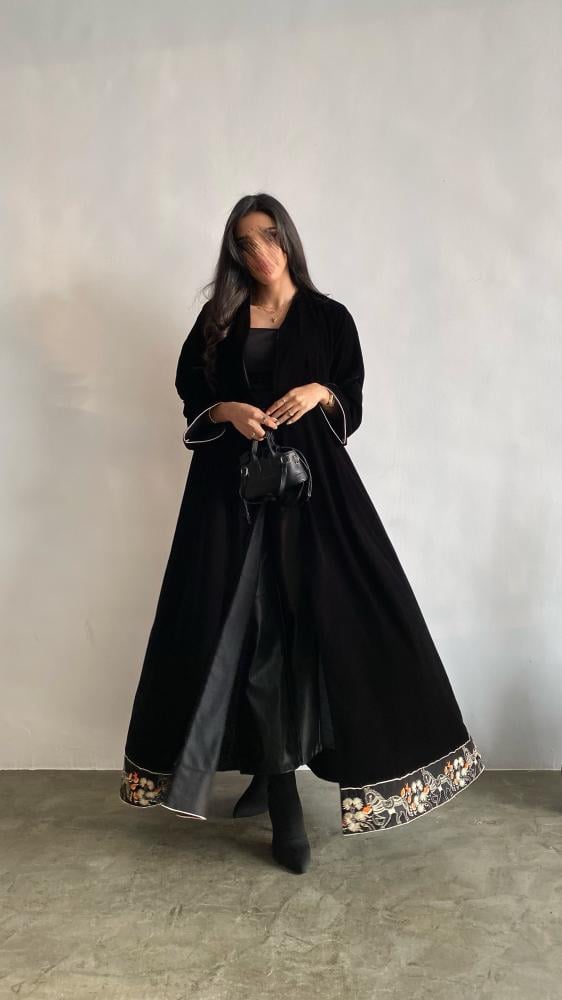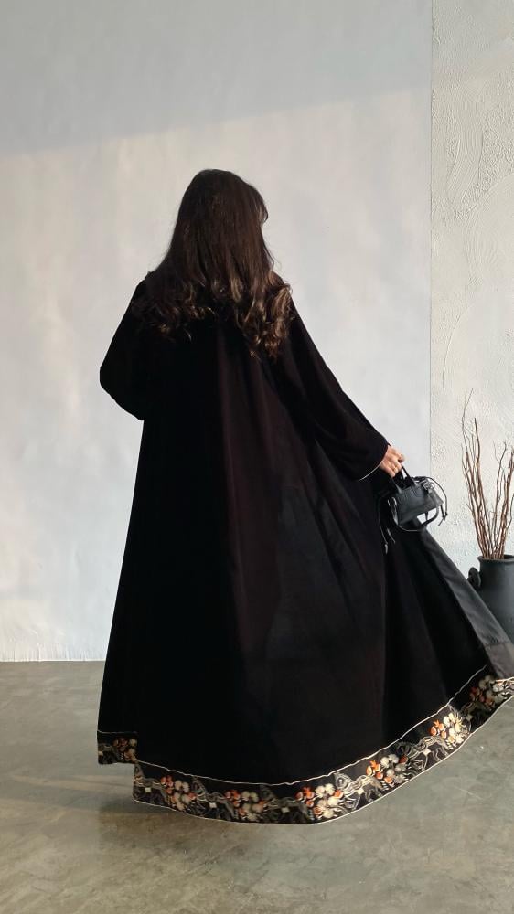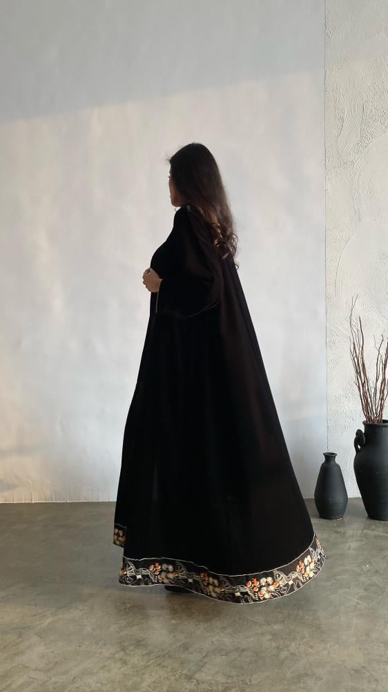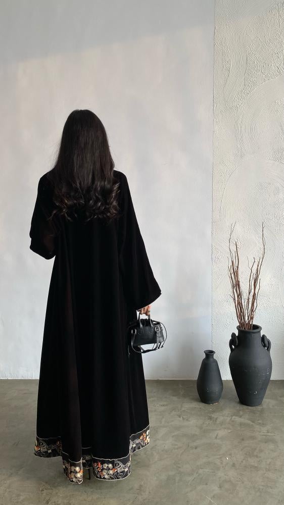 عباية سوداء كلوش بقماش مخمل ، طرف العباية مزينه بكلفة