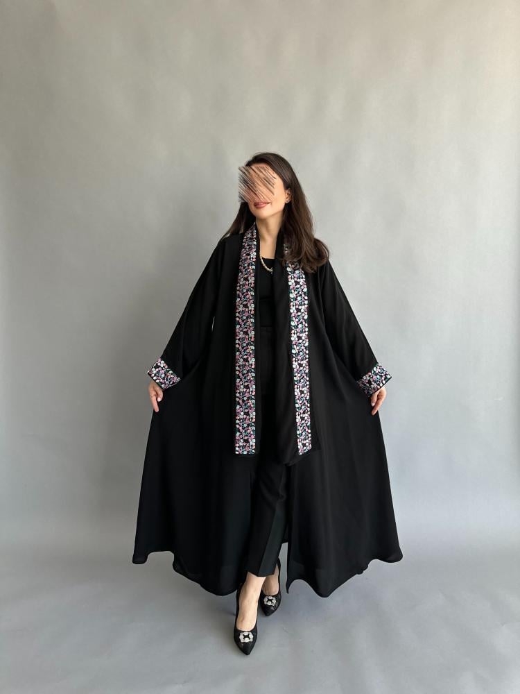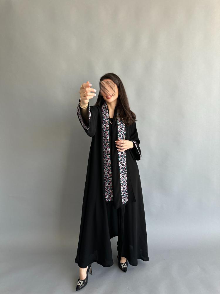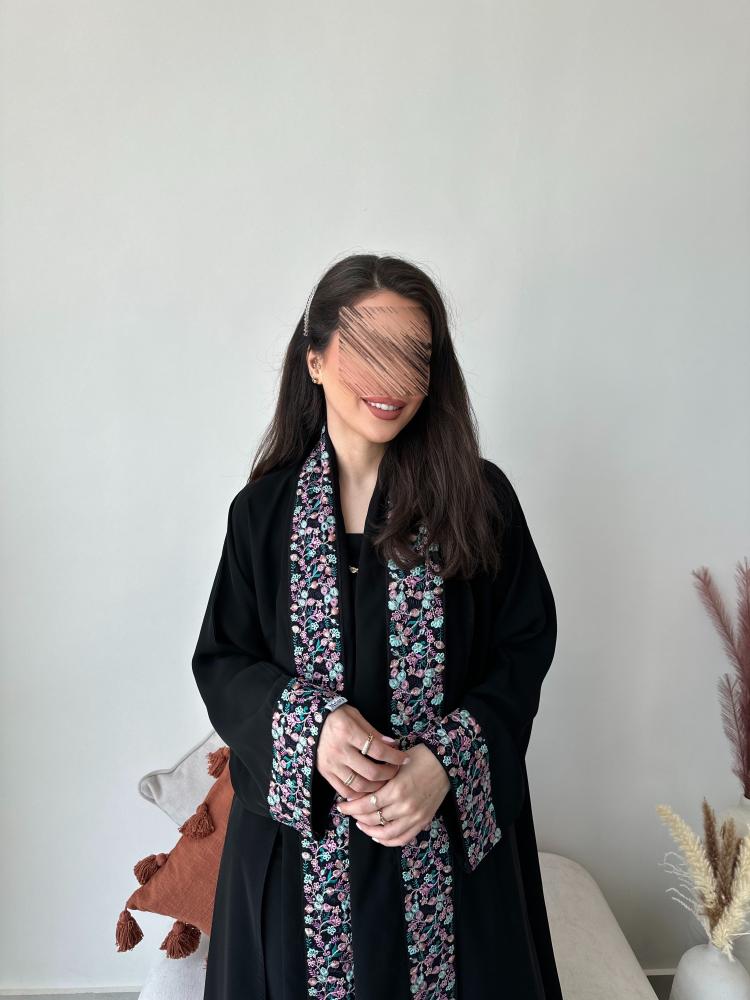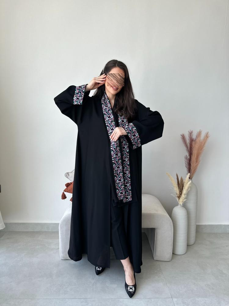 عباية سوداء كلوش بقماش كريب ملكي مزينه بورود بالأكمام و وطرحة بكلفة
